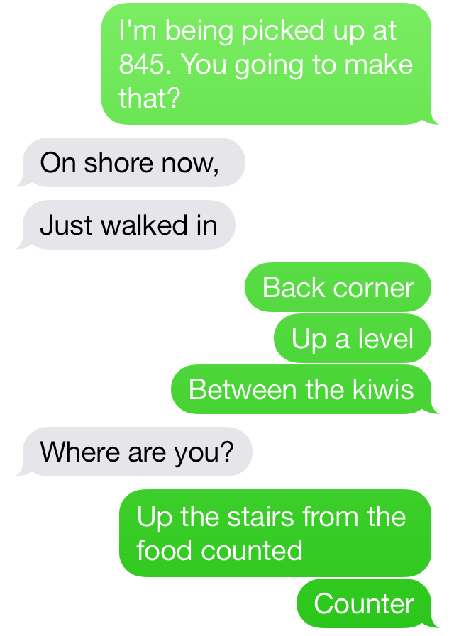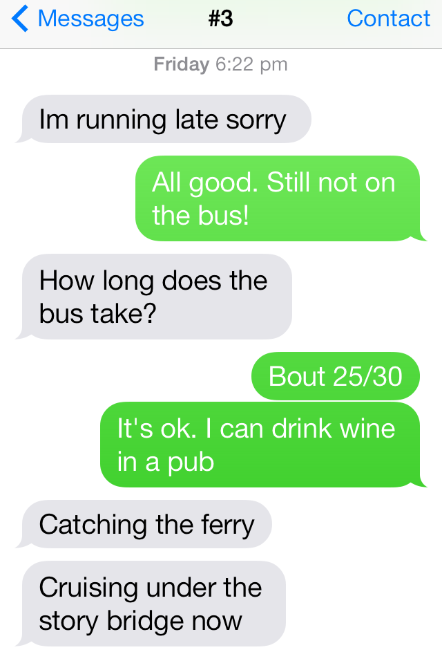 | Time Lapse: Catching the ferry came through at about 7.20 Cruising came through about 7.40 The rest of the messages flowed through from 7.40pm |