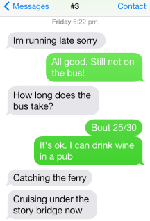 We were meeting at 7. I was at the bus stop at 6.30. I am supposed to allow myself forty minutes to catch a bus to the city. I hadn’t. At 6.22 I get a text message from #3. ‘Sorry, running late.’