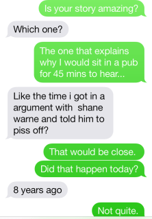 His meaty hands poor me a beer and it is only then that I notice the differences between his profile photos and who is actually sitting in front of me. This man is about ten years older than the profile photos I have seen. There is not trace left of the man that plays frisbees on the beach, climbs mountains or hangs out in large groups of people. What I have is a man whose jowls almost touch his neck wearing a suit coat with what I can only imagine he thinks is a cool t-shirt. He’s talking, and he talked a lot. He told me the Shane Warne story. He told me a number of other stories about a life lived long ago. At about the twenty minute mark, he came up for air. ‘Are there scrub turkey’s everywhere in this city?’ I answer yes. And inform him that between the possums and the scrub turkeys, Brisbane’s wildlife population is rife through suburban and city homes alike. ‘Oh.’ was his response.